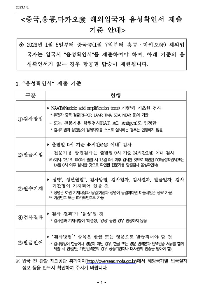코로나 음성 증명서