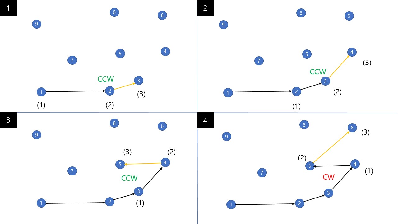 아래는 각을 계산하는 방법이다. 세 점을 순서대로 연결했을 때, pt2에서의 각을 계산하고 해당 각이 CCW인지 CW인지 확인하는 방법이다. 이때 ConvexHull 탐색에서는 반시계 방향으로 탐색을 진행하기 때문에 이루는 각이 CCW이어야 한다.